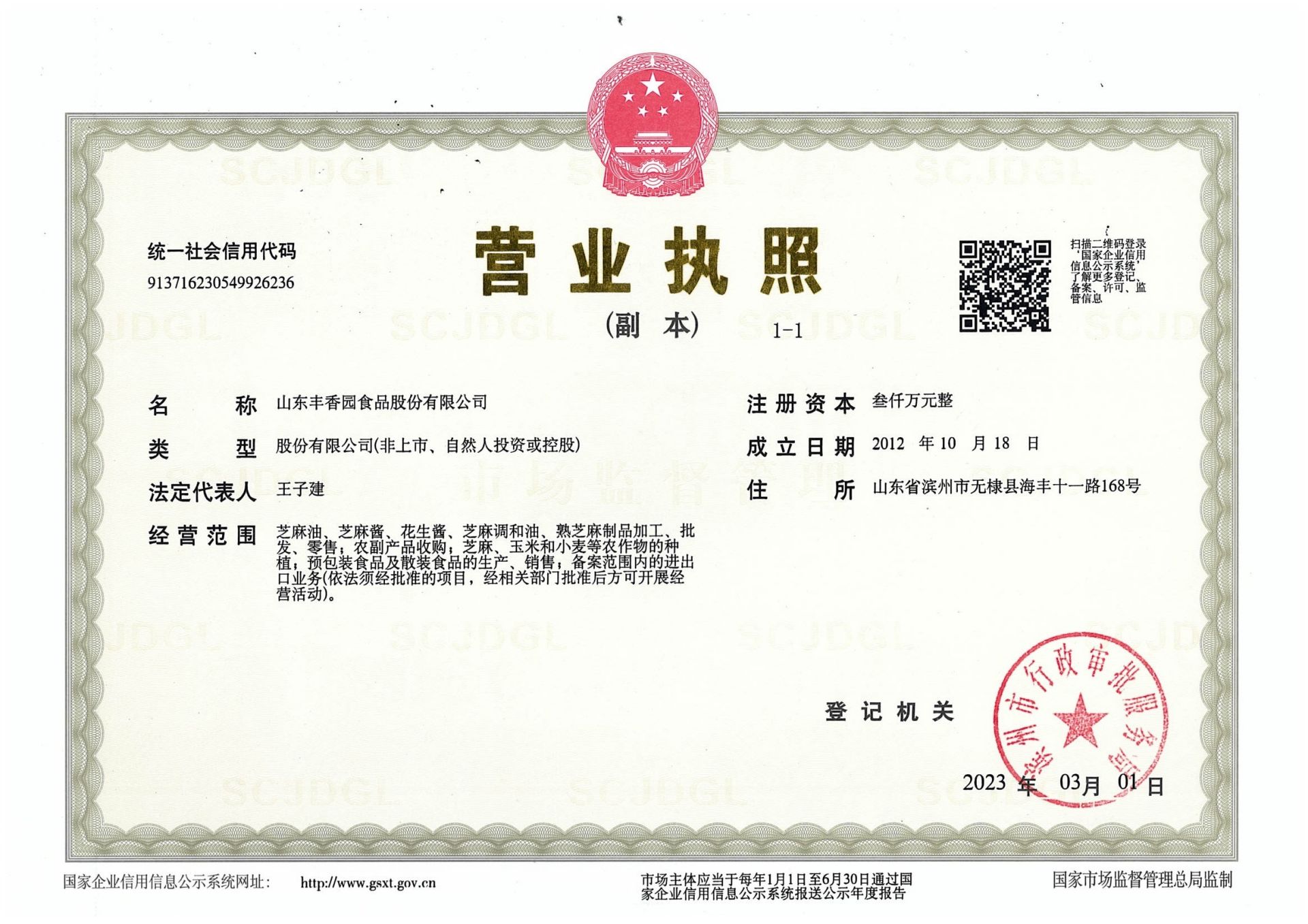 山東豐香園食品股份有限公司位于無棣縣西城工業園,成立于2012年,注冊資本3000萬元,員工60多人,年銷售收入8000多萬元,是“國家高新技術企業”、“中國好糧油”示范企業、“食安山東”示范生產加工企業,公司集綠色、有機芝麻食品標準化、生產加工、研發、出口銷售為一體的山東省農業產業化“重點龍頭企業”。        公司獲得HACCP國際質量體系認證、ISO9001:2015質量管理體系認證,產品獲得美國FDA認證、美國、歐盟有機食品認證、英國BRC體系認證、A級綠色食品認證、GB國標有機食品認證。        公司主要產品有芝麻油、芝麻醬、花生醬、芝麻粉和烘焙芝麻、兒童芝麻食品系列等六大種類上百個品種,產品出口美國、日本、韓國、新加坡、俄羅斯、澳大利亞、美國、等30多個國家。2018-2019年連續兩年芝麻食品出口量排名山東省第三位、濱州市第一位。        山東豐香園食品股份有限公司是國家級高新技術企業,建有省級“一企一技術”研發中心、市級企業技術中心和市級工程實驗室、市級工程技術中心等多個創新平臺,擁有發明專利2項,實用新型專利21項,先后獲得省級“專精特新”中小企業、市級農業產業化聯合體、科技型中小企業、濱州市級瞪羚企業、市級“一企一技術”創新企業和濱州市新興產業“白名單”企業等榮譽稱號。